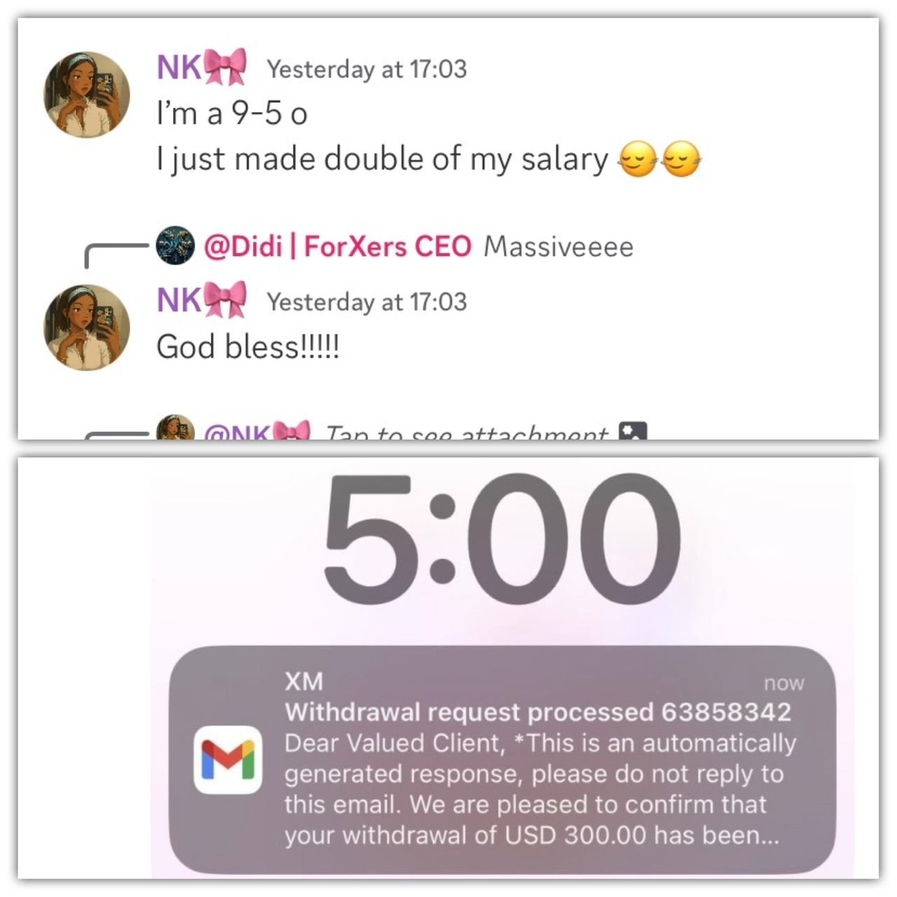 NK doubled her 9–5 salary in a single day using copy trading.